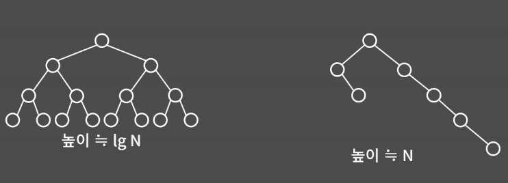 우리는 O(lgN)에 수행하기 위해 이진 트리를 사용하게 되는데 다음과 같이 연결 리스트와 별반 차이가 나지 않게 되었을 때 이진 트리를 쓰게 되는 이유가 없어지게 된다. 순차적인 값들이 노드에 삽입되는 경우에 편향된 그래프 트리가 만들어지게 되기 떄문에 해당 사항을 해결하기 위한 방법을 고민해야한다.